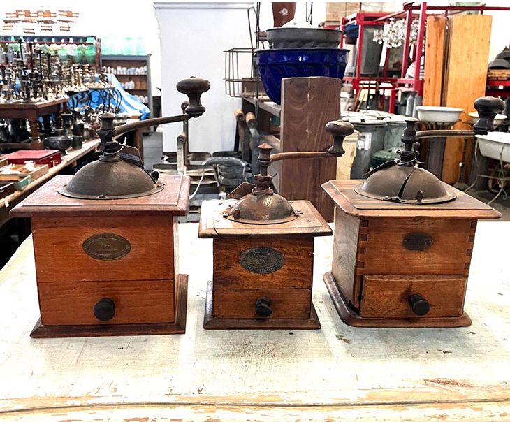 1930~40年代のプジョー社やジャピー社製コーヒーミル。※豆を挽くことは可能ですが、クリーニングをしていないため観賞用となります。