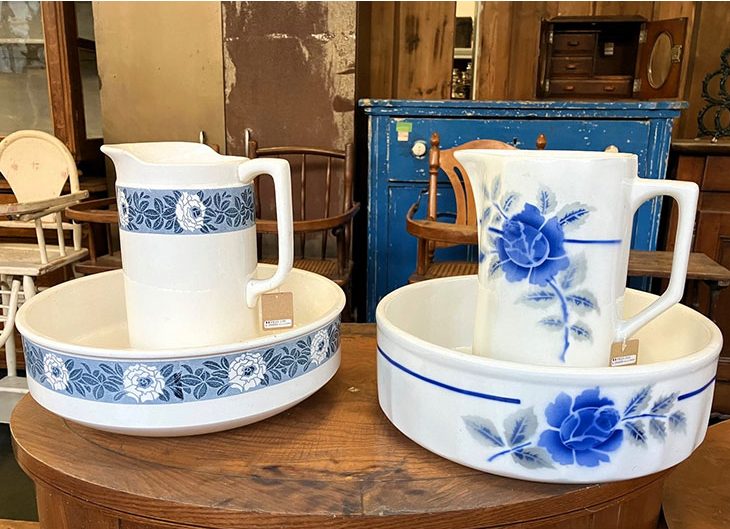 昔の手洗い場で使われていた洗面ボウルとピッチャーのセット。大きめなのでインテリアのアクセントに。