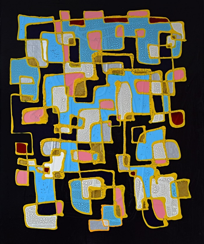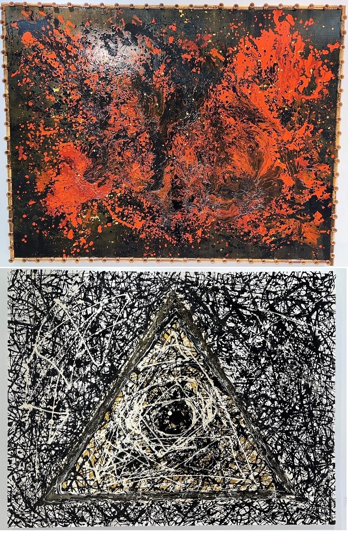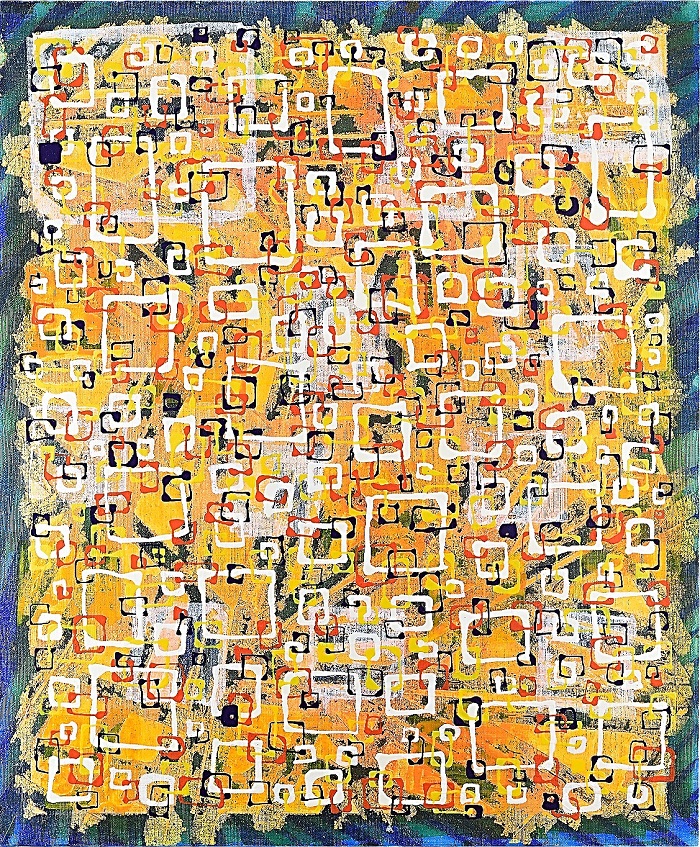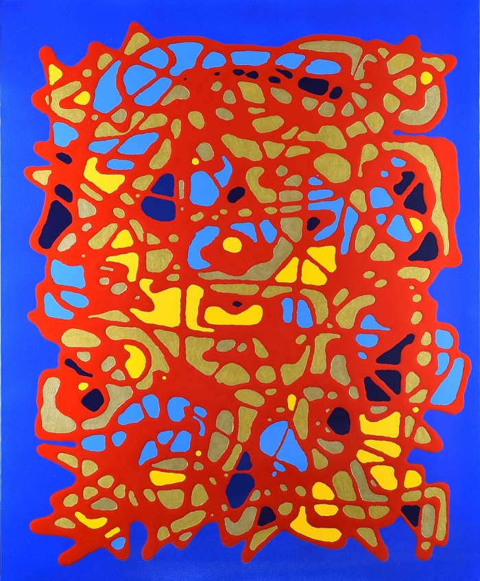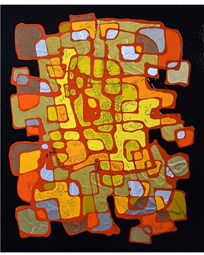 溶岩のように流れる暖色とひび割れた質感は、人類最古の表現衝動を呼び起こし、洞窟壁画に秘められた祈りや神話の断片を現代の視覚言語で再構築。形なきものに意味を見出す、人間の根源的な感性を呼び覚ます“生きた壁画”のような作品です。