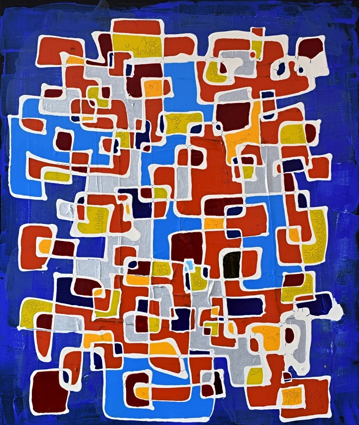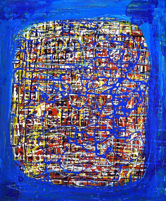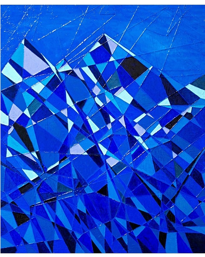 さまざまなブルーの幾何学模様で構成された画面と立体的に引かれたエッジの効いたラインが特徴的。形状と色彩のリズムを感じられ、抽象化された小さなディテールの集約が大きな青い山を作っているというミクロとマクロの関係性を表現している作品です。