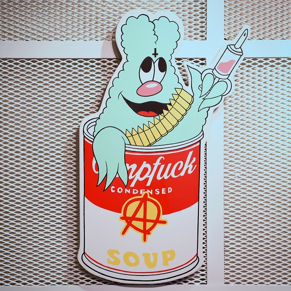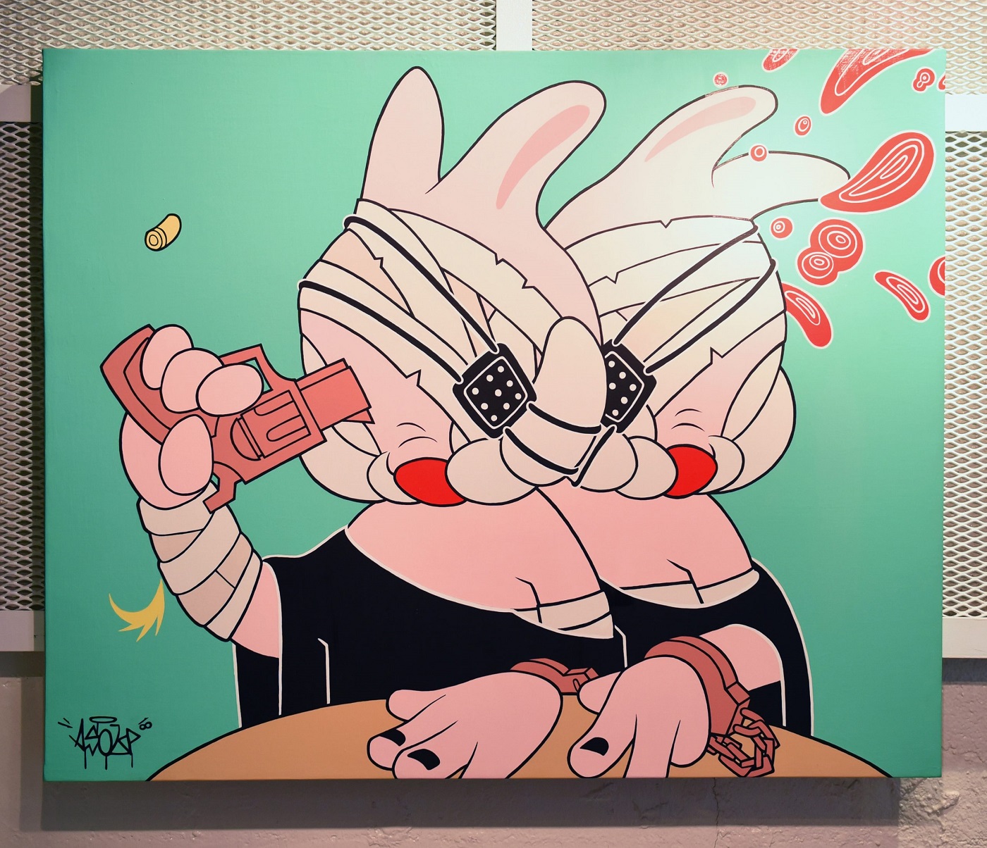 夜おそく電気椅子に括られたウサギを見ました。倫理に反し星々を喪失した空虚な眼、その体躯は膨れ上がったエゴと享楽の過剰摂取を体現し、せめて己に正直に生きようと死を享受した。彼は神聖さを伴う碧い光を放ち磔にされたキリストのようにも見えました。これは複合化された現代社会に生き、絵を描き続けているAruta Soupが作り出した新しいイコンだと考えています。近年作家が生み出していくSUISIDEシリーズ、またそこから派生してきたDEATHROWシリーズのペインティング作品をぜひご高覧ください。