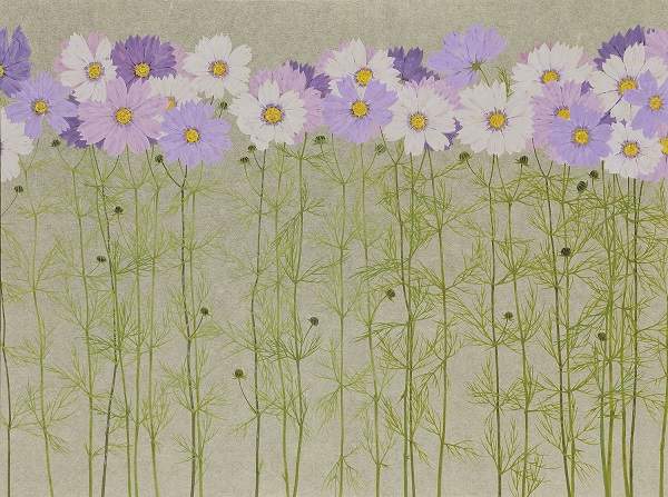 一見同じ花を反復しているような作品でも、咲き具合や朽ちる加減がそれぞれ異なる。細部を観察し季節に応じた花を描く日本の伝統的な感覚を、日常に馴染みある花柄を通して現代の暮しの中に取り込む。