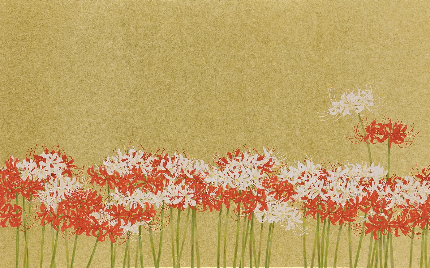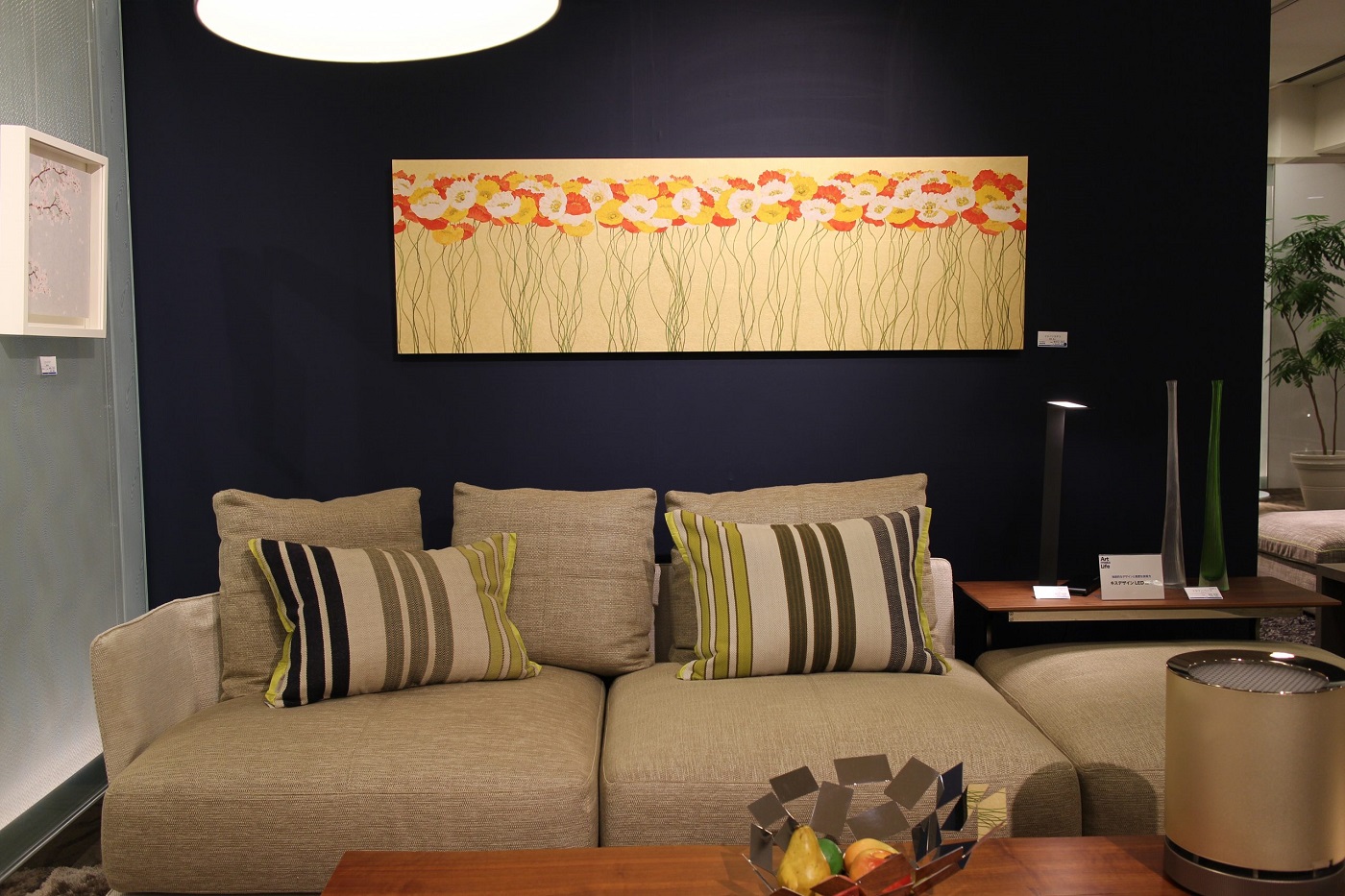 リズミカルに繰り返されるポップな花模様は、日本画のイメージを一転させ、現代の住空間にもインテリアとして溶け込む。同時に、再現可能なプリントとは違い描かれた花柄にはひとつとして同じものはない。