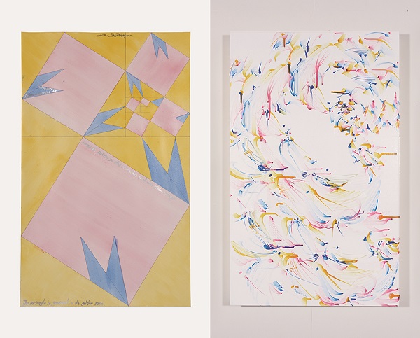 左)村山悟郎《ダイアグラム<矩形の生成-黄金比Ⅲ>》2021.水彩紙、アクリリック、コバルト顔料 430X695mm