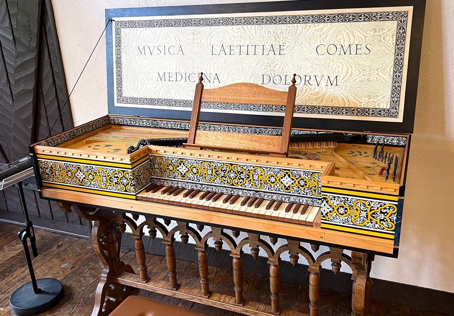 今回ヒュッテの全館にあしらわれたウィリアム・モリスのテキスタイルは英国チューダースタイルの八ヶ岳高原ヒュッテのインテリアと素晴らしい調和を見せていますが、この日はモリスが愛聴していた小型のチェンバロ「ヴァージナル」の演奏会が開催されました。このヴァージナルは八ヶ岳のカラマツから作られたカラマツチェンバロと同じ作者久保田チェンバロ工房で作られたものですが、まるでアンティークそのもののようなたたずまいです。