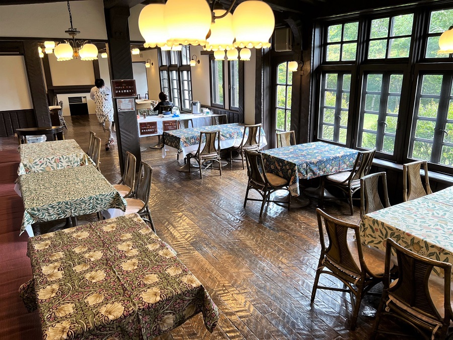 ウィリアム・モリスのテーブルクロスが敷かれ、窓の外に高原の緑が広がる美しい八ヶ岳高原ヒュッテ1階のダイニングルーム。この時空を超えたような世界でヴァージナル演奏会とアフタヌーンティーを楽しむという贅沢な時間を過ごしていただきました。