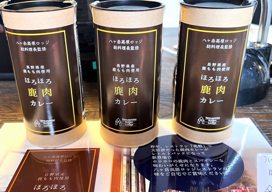 さてこの会場ではあらたに’21年秋冬のジビエシーズンにロッジのレストラン「花暦(はなごよみ)」で大人気を博した長野県鳥獣被害対策の一環からうまれた、長野県産の新鮮な鹿肉のもも肉だけを使った深い味わいの鹿肉カレーのレトルトカレー試食会が開催されました。総料理長入魂のメニューは来場された100人近いお客さまに大好評で、多くのお客さまに試食後お買い求めいただきました。