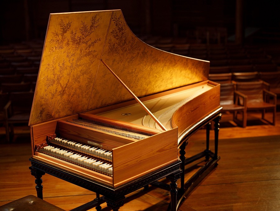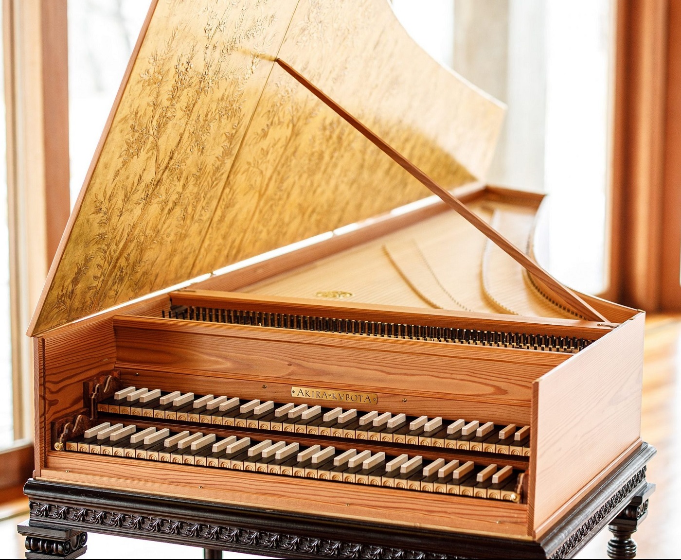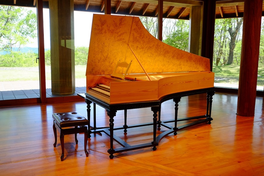 八ヶ岳高原音楽堂の開館30年を記念して、2018年に完成したチェンバロ。素材は地元・八ヶ岳で育った樹齢110年のカラマツで、美しい木目を生かしたシンプルなデザインが特長です。16〜18世紀に欧州宮廷社会で流行したチェンバロは、バッハ以前の音楽「古楽」の代表的な楽器で、繊細な音色が魅力です。