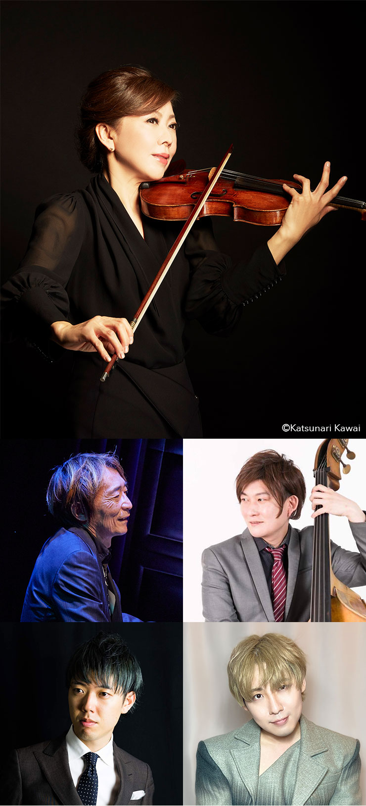 ●寺井尚子(ヴァイオリン)Naoko Terai 繊細さと情熱的な表現力を併せ持つ唯一無二の演奏で、世界を舞台に活躍するジャズ・ヴァイオリニスト。1988年のプロ・デビュー以来、人気の高いコンサートを中心に、テレビ、ラジオ、CMへの出演や楽曲提供をはじめ、ジャズの枠組みだけにとどまらず、幅広く積極的に音楽活動を展開。ケニー・バロン Pに招かれてのニューヨークでの初レコーディング、その後もリシャール・ガリアーノ Acc、リー・リトナー Gt、ボブ・ジェームス P、ハービー・ハンコック P、メロディ・ガルドー S s wといった世界的アーティストと数多くの共演を重ねている。「文化庁芸術選奨文部科学大臣新人賞(大衆芸能部門)」(2010年)、「日本ゴールドディスク大賞 ジャズ・アルバム・オブ・ザ・イヤー<邦楽>」(2004 年)他、受賞。●北島直樹(ピアノ)Naoki Kitajima 1977年、青山学院大学在学中にプロ・デビュー。松本英彦、日野元彦、本多俊之のグループでレコーディングにも参加。阿川泰子のアルバム「ジャーニー」、「サングロウ」でアレンジ担当など、多岐にわたる音楽活動を精力的に行う。●仲石裕介(ベース)Yusuke Nakaishi 大森成彦氏の演奏に感銘を受け、コントラバスを始め、関西のホテルやラウンジで演奏活動をスタート。前田憲男氏、井上順氏等のレコーディングや東宝ミュージカル、雪村いづみ氏、中本マリ氏等との共演など、多岐にわたって活動中。●荒山 諒(ドラムス)Ryo Arayama 通っていた小学校でjazzとdrumsに出会い、big band jazzにのめり込む。その頃より愛知万博、東京ディズニーリゾートでの演奏など、数々のステージを経験。昭和音楽大学ジャズコース入学と同時に上京、小山太郎氏に師事。昭和音楽大学特別賞を受賞し卒業。●LEN(ヴォーカル)韓国ソウル出身のシンガーソングライター。NHKで放送された大ヒット韓国ドラマ『シークレットガーデン』の挿入歌がきっかけで来日。さだまさしや山下達郎、ユーミンなどのカヴァーアルバム「Memory」、オリジナルアルバム「君の世界」を含め多数発表し精力的に活動をしている。