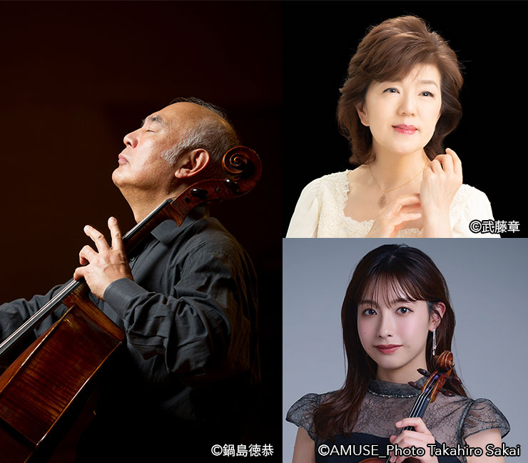 ●堤 剛(チェロ)Tsuyoshi Tsutsumi 日本を代表するチェリスト。桐朋学園で齋藤秀雄に師事。1963年ミュンヘン国際コンクールで第2位、続いてカザルス国際コンクールで第1位入賞、現在まで世界各地から招かれリサイタル開催。1993年『日本藝術院賞』、2009年秋の紫綬褒章を受章。2013年、文化功労者に選出。現在桐朋学園大学特命教授(元学長2004~2013年)、韓国国立芸術大学客員教授。サントリーホール館長、日本芸術院会員。●伊藤 恵(ピアノ)Kei Itoh 桐朋学園高校を卒業後、ザルツブルク・モーツァルテウム音楽大学、ハノーファー音楽大学においてハンス・ライグラフ氏に師事。1983年第32回ミュンヘン国際音楽コンクールのピアノ部門で日本人として初の優勝。ミュンヘンでデビュー。第70回文化庁芸術祭賞優秀賞を受賞。また、サイトウ・キネン・フェスティバル松本などに参加。現在、東京藝術大学教授、桐朋学園大学特任教授。●荒井里桜(ヴァイオリン)Rio Arai 1999年東京都出身。東京藝術大学音楽学部を特待奨学生として在籍したのち、首席卒業。ローザンヌ高等音楽院卒業。第15回東京音楽コンクール弦楽部門第1位及び聴衆賞。第87回日本音楽コンクールバイオリン部門第1位。NHK交響楽団、新日本フィルハーモニー交響楽団等と共演。
