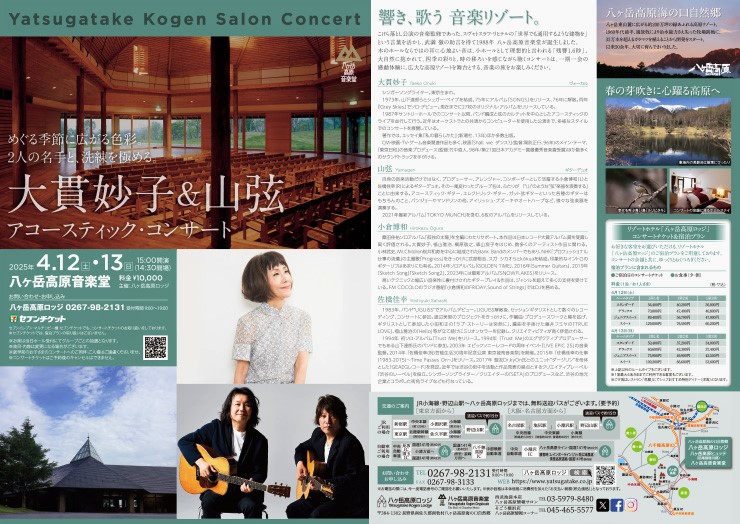 C77 2025年4月 八ヶ岳高原音楽堂サロンコンサート 「八神純子」「大貫妙子 & 山弦」「篠崎史紀 弦楽アンサンブル」「YAMATO String Quartet」「大竹しのぶ」「小椋 佳」 めぐる季節に 広がる音色。 際立つ表現力で紡がれる歌。