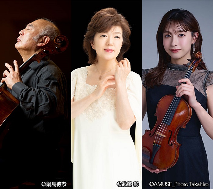堤 剛・伊藤 恵・荒井里桜 真夏の三重奏 2025年8月13日(水)14:30開場/15:00開演 ●堤 剛(チェロ)Tsuyoshi Tsutsumi 日本を代表するチェリスト。齋藤秀雄に師事。1961年インディアナ大学留学、ヤーノシュ・シュタルケルに師事。1963年ミュンヘン国際コンクール第2位、続いてカザルス国際コンクールで第1位入賞。1993年『日本藝術院賞』、2009年秋の紫綬褒章。同年天皇陛下御在位二十年記念式典にて御前演奏。2013年、文化功労者。現在桐朋学園大学特命教授(元学長2004~2013年)公益財団法人サントリー芸術財団代表理事、サントリーホール館長、日本芸術院会員。●伊藤 恵(ピアノ)Kei Itoh 桐朋学園高校を卒業後、ザルツブルク・モーツァルテウム音楽大学、ハノーファー音楽大学で名教師ハンス・ライグラフ氏に師事。1983年第32回ミュンヘン国際音楽コンクールのピアノ部門で日本人として初の優勝。現在、東京藝術大学教授、桐朋学園大学特任教授。●荒井里桜(ヴァイオリン)Rio Arai 1999年東京都出身。東京藝術大学音楽学部を特待奨学生として在籍、首席卒業し、アカンサス音楽賞及び三菱地所賞受賞。在学中に福島賞、安宅賞、宮田亮平奨学金受賞。ローザンヌ高等音楽院卒業。第15回東京音楽コンクール弦楽部門第1位及び聴衆賞。第87回日本音楽コンクールバイオリン部門第1位。