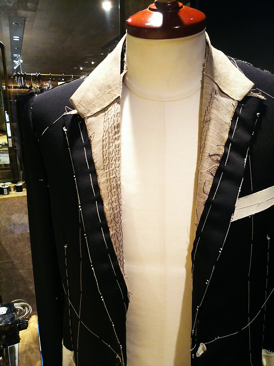 1人の職人が採寸し、型紙を描いて切り、手仕事で一針一針縫いあげていきます。立体感を出すためには目に見えない芯地にハの字のハ刺しを行い、内ポケットの仕上げは一般的な「両玉縁仕上げ」ではなく繊細ですっきりと見た目も美しい「モミ玉縁仕上げ」を使います。もちろんお台場仕立てや襟や肩のラインにもすべてハンドステッチが施されるため、シルエットだけでなくディテールを見ても、手仕事ならではの品格ある完成度の高さにあふれ、レディメードとの違いはあまりにも歴然としています。