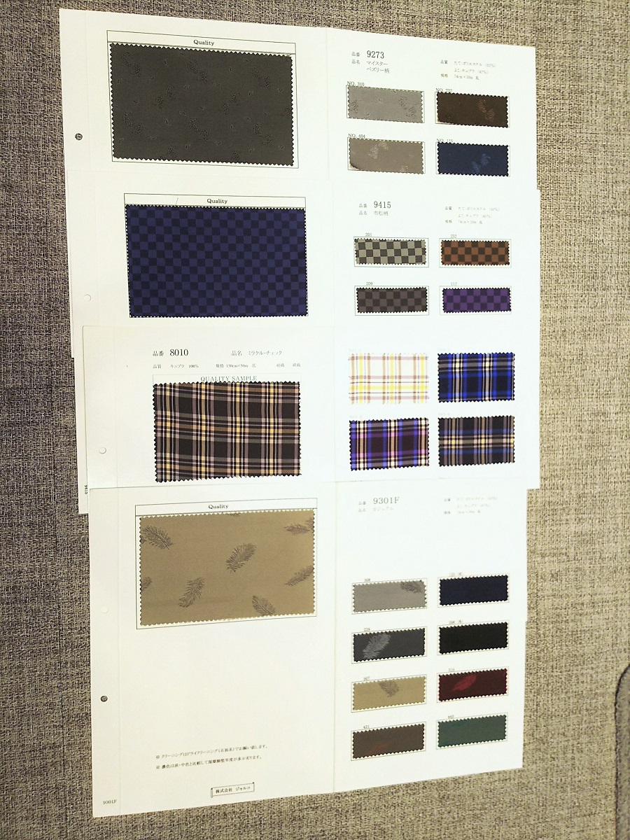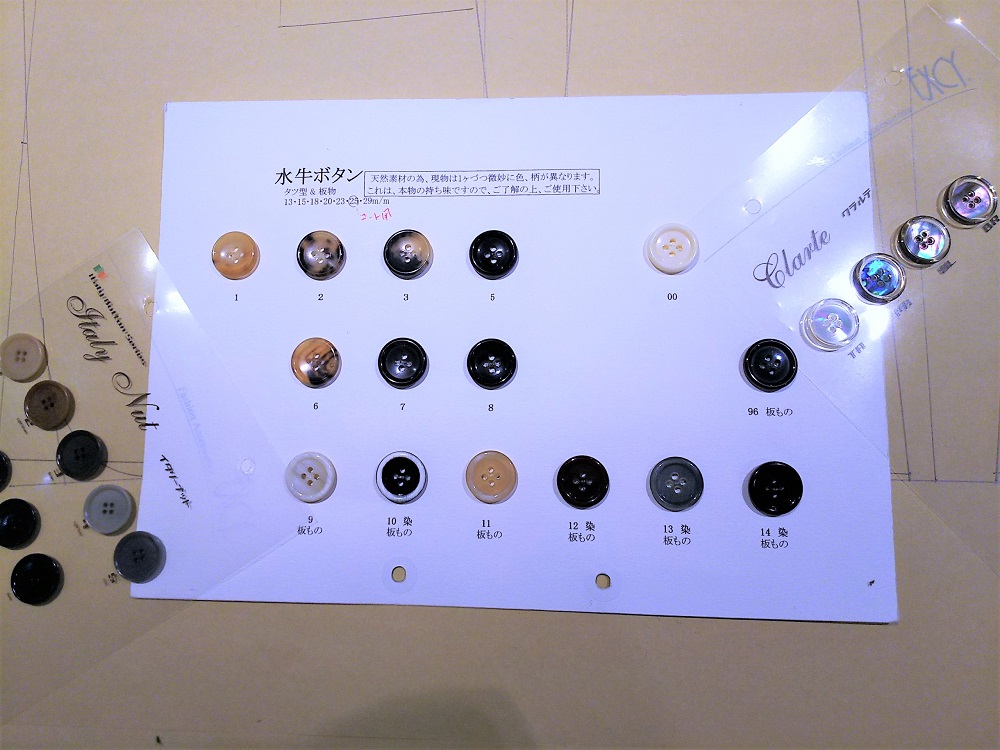 全てを選ぶオーダーメードは選ぶ楽しさ、迷う楽しさが満載です。肩や襟の形や幅、ポケットの形や数、最も重要な服地、迷ってしまうほどバラエティのある裏地、使うボタンも水牛、貝だけでなくビンテージ感あふれるナッツボタンまで揃います。こういったディテールにこだわり、他人と違う一着に仕上げるのもフルオーダーの楽しみの一つです。