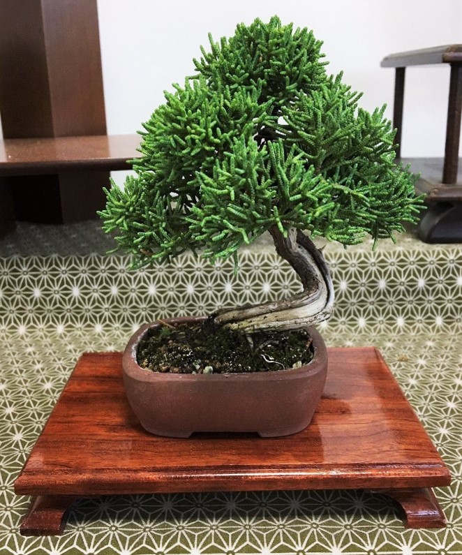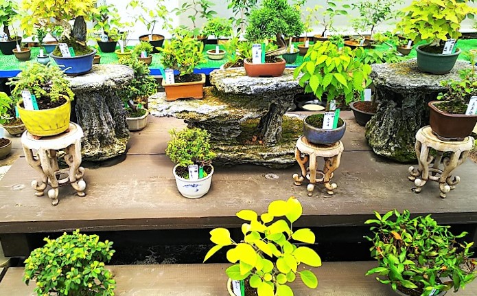 伝統的な日本の名物、盆栽も各種そろっています。今や国際的に知られた日本文化の盆栽は、飾るための花台なども充実しています。