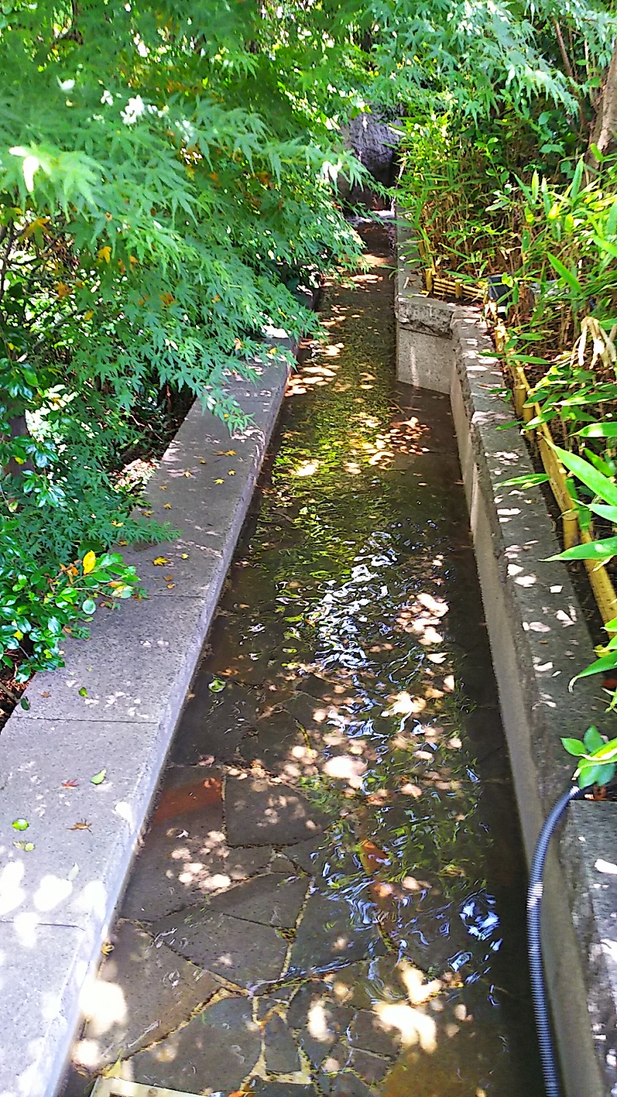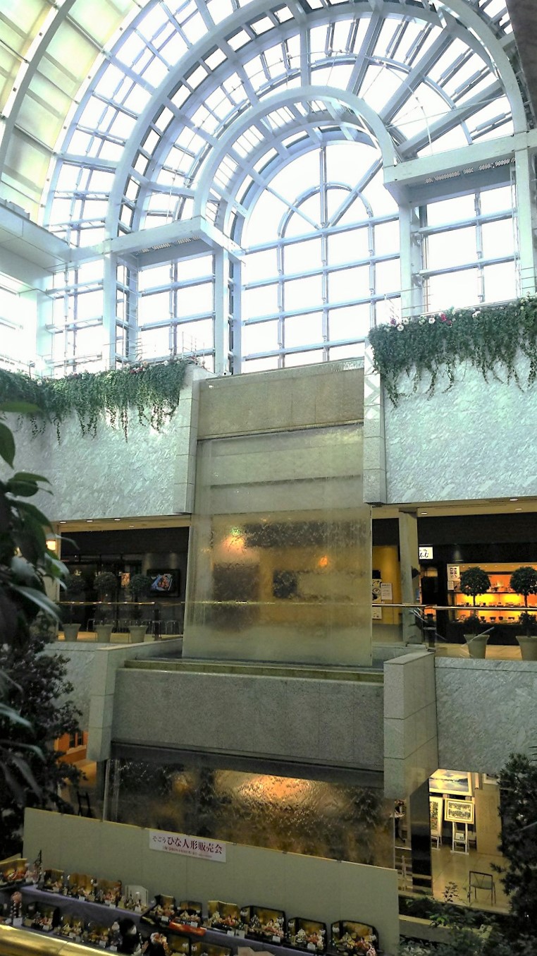 本館地下フロアの広場に流れ出る滝は夏には涼やかな環境を演出してくれます。(上)そして本館上層階2層分にも滝が流れ落ち、レストラン街では透明な滝の裏側を見ることもできます。
