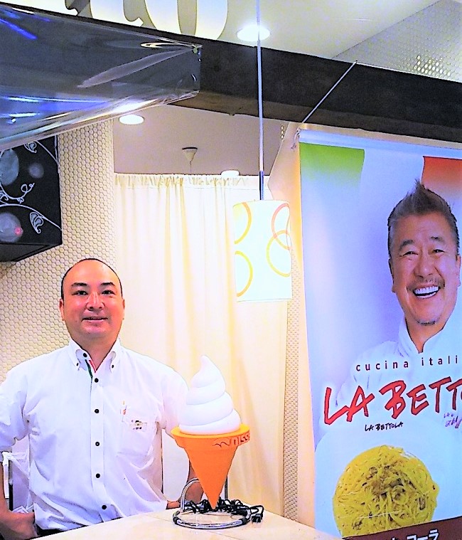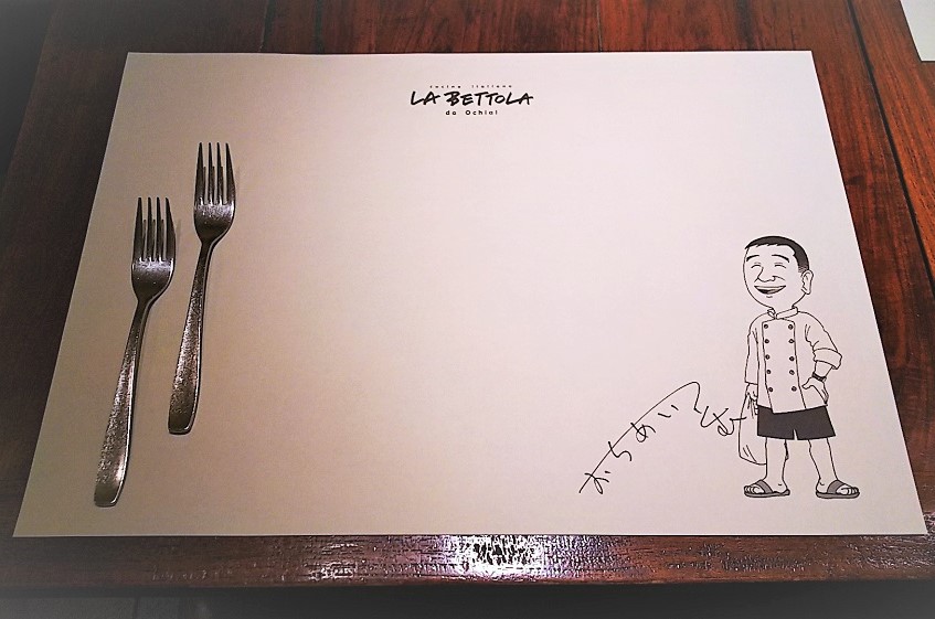 飾り気のないオリジナルのペーパーテーブルナプキンに描かれた落合シェフは半ズボンとサンダル履きで買物袋をぶら下げています。このあたりにも、「気取らず毎日食べても飽きないイタリアの食堂(ベットラ)」というコンセプトがよく表れています。