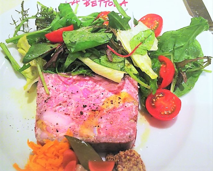 前菜の一例「自家製テリーヌ」。テリーヌとフォカッチャで始まるお食事は、独特な美味しさでコース料理を盛り上げてくれます。さすがはフレンチもイタリアンも本場で修業された落合さんの一皿。キャロットやサラダの付け合わせまで隙きがありません。