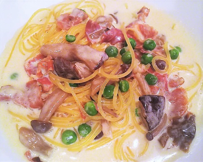 「パルマ産生ハムとグリーンピース いろいろきのこのクリームソーススパゲッティ」は落合シェフならではの繊細な味のハーモニーが抜群の美味しさで女性ファンから強い支持を集めています。