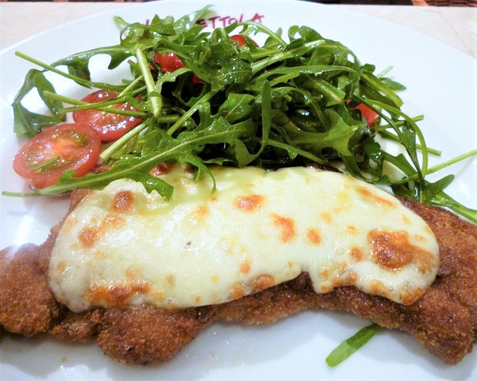 「秀味豚のカツレツ モッツァレラチーズのせ」もラ・ベットラ・ダ・オチアイならではの美味しさ。イタリアンな味わいと日本人に馴染みの深いポークカツレツが合体した、ほかでは味わえない落合シェフならではの味。こちらも独自の人気商品です。