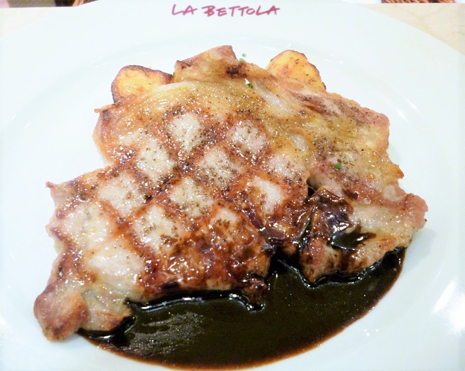 「秀味豚のグリル バルサミコソース」。これもブランド肉をイタリアングリル式に網跡も美しく焼き上げてある人気メニューです。イタリア式のグリル料理は良い素材のうまみを引き出すのに最適です。