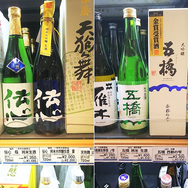 右) 山口県、五橋の酒井酒造は明治4年に錦川の伏流軟水に恵まれた岩国市で創業。五橋の名は錦川にかかる五連の反り橋「錦帯橋」に由来。「五橋純米生酒」は山口県産米全量で醸す純米生酒。甘やかさを残すことで口当たりが良く、適度な酸味で後口がキリっと締まる軟水仕込み特有のソフトな酒質。「五橋西都の雫」は令和2年酒造年度全国新酒鑑評会金賞受賞、令和元酒造年度全国新酒鑑評会入賞、平成15、16、17、19、20、22、23、24、25、27、28酒造年度全国新酒鑑評会金賞受賞。