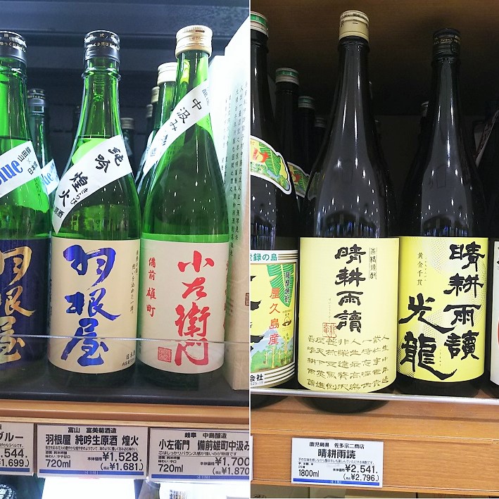 右)九州は日本酒だけでなく焼酎も盛んです。鹿児島県「晴耕雨読」の佐多宗二商店は明治41年創業の薩摩焼酎。「晴耕雨読」は芋焼酎ですが米麹も使われ、臭みがなくすっきりと飲めます。 口に含むと鹿児島銘菓「かるかん」やほのかなさつま芋の甘味も感じ、酸のキレもお楽しみいただけます。飲み方はオールマイティです。