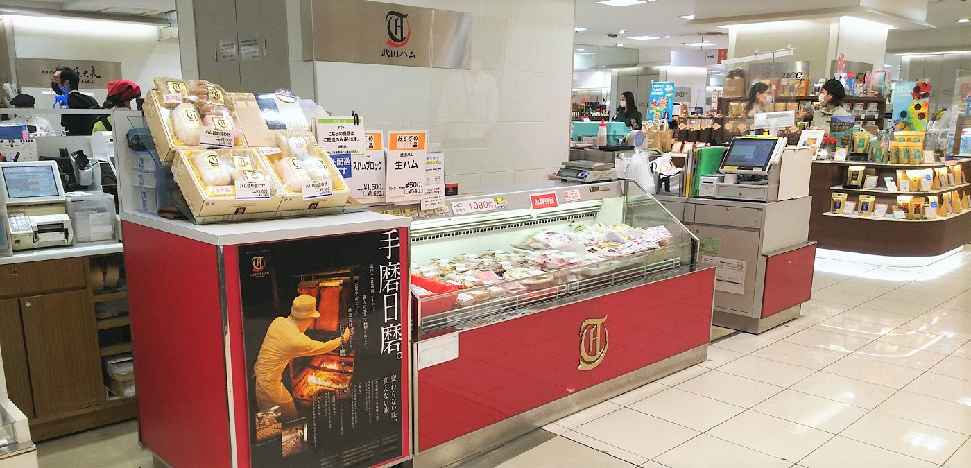 武田ハムの歴史は現社長が新宿区の食品スーパーの食肉部門から独立したことに始まります。約50年前、急速に広まり始めたファミリーレストランへの食肉卸とハムの製造を始めました。職人気質の社長は海外のハムを参考に、なるべく添加物を入れない昔から行われている技法で作ったハムを本場ヨーロッパ同様、手ごろに毎日食べられるよう製造方法を進化させ、また価格にもこだわりました。そして多くの専門レストランからの厳しい注文に応えるうち商品のバラエティーも増え、30年ほど前に、西武池袋本店への催事出店を契機に常設売場ができました。現在は池袋本店以外にも首都圏に複数の売場ができていますが、時間のかかる本格的製法のため、大手メーカーのような大量販売はできません。武田ハムは職人気質を守りながら現在も手ごろな価格で味わえる本格的ハム・ソーセージ店として池袋本店で多くのお客さまに愛されています。【2021.4月記】