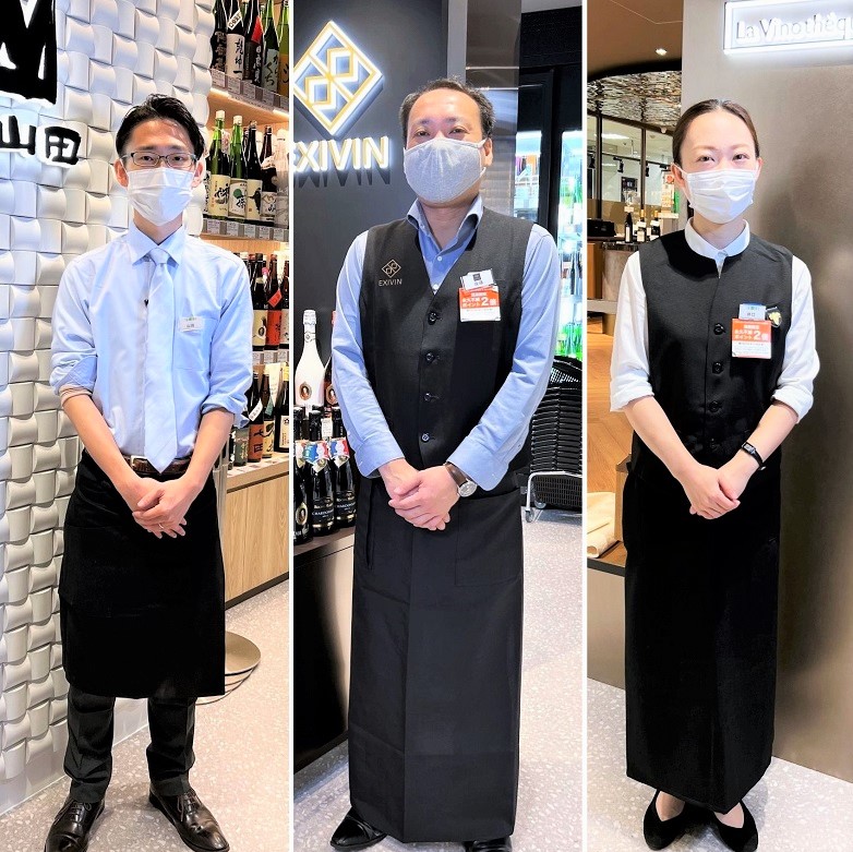 左の酒商山田の店長、山田氏佳徳氏はS・S・I認定日本酒ソムリエとして美味しい飲み方や楽しみ方を提案するプロの「唎酒師(ききさけし)」とJ・S・A認定のSAKE DIPLOMA資格を持つ日本のお酒のプロです。中央EXIVINの後藤裕之氏は<一社>日本ソムリエ協会認定のソムリエです。右のVinotéque店長の井口由梨氏は、動画に登場する中村俊喜氏と共にJSA認定ソムリエ。酒蔵のメンバーは数多くのお酒のプロたちがお客さまのご相談にお答えしますので、気軽にお声がけください。