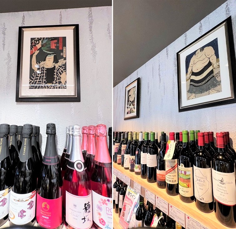 最近は日本ワインの評判は世界的に広まりました。日本の酒のエキスパート、酒商山田は当然日本の各産地のワインの情報がふんだんに集まってきており充実の品ぞろえです。お相撲さんの浮世絵があるコーナーが日本ワインコーナーの目印です。