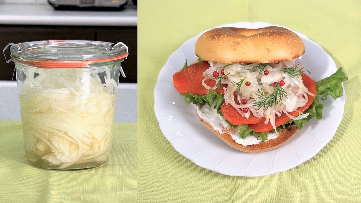 春は玉ねぎが旬です。西武池袋本店地下2階生鮮倶楽部の「ころくや」にもたくさんの旬の玉ねぎが並んでいます。管理栄養士の金井奈央美は、今おいしい玉ねぎを使って「玉ねぎの酢漬け」とこれを使った「玉ねぎとスモークサーモンのベーグルサンド」の作り方を提案しています。「玉ねぎの酢漬け」はきちんと殺菌した保存容器に入れて1週間ほど使えます。これを使った「玉ねぎとスモークサーモンのベーグルサンド」はニューヨークを代表するグルメ。玉ねぎの甘みとディルとピンクペッパーの爽やかな刺激がサーモンとほどよくマッチします。調理は7階インテリアフロアのキッチンスタジオで行いました。キッチンスタジオでは年間を通じて週末を中心に多くの調理イベントを開催しています。「玉ねぎとスモークサーモンのベーグルサンド」は朝食にもランチにもぴったりのメニューです。【23年3月記】