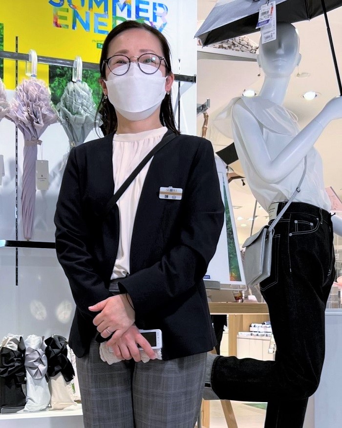 婦人雑貨フロアの営業支援担当の諌山さんは、ここ数年変化のなかった日傘のまったく新しい展開に驚いています。晴雨兼用やUVカットは当たり前になり、どんどん小さくなるバッグに無理に入れるための3つ折りや小型化へのこだわりがなくなって、ストレートや2つ折りが増え、畳んで手に持った時の美しさや開いたときの顔映りといった「魅せるため」「映えるため」のアクセサリー要素が強くなったと感じています。昔紳士アクセサリーに万年筆や腕時計といった機能のあるアイテムが選ばれていたように、女性のアクセサリーも純粋な飾り物から、日傘など機能アイテムに変化してきたのかもしれませんね。