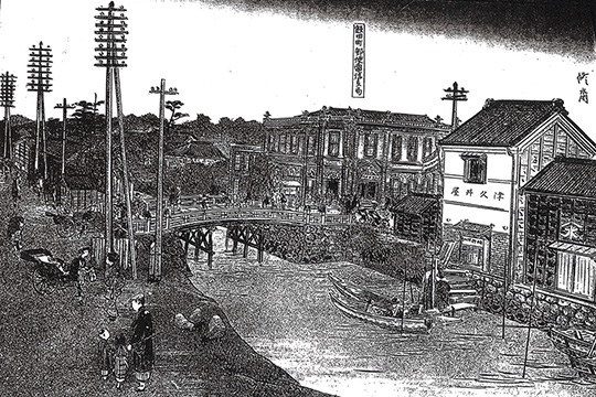 この絵は明治28年ごろの靖国通りに架かる俎板橋、右横に現九段郵便局が描かれています。路地を入った所が寿司政(現在の本店)の場所。三代目は大正12年の震災で三崎座から焼け出され現在の九段下に店を構え、戦後いち早くすしを握り始め、昭和48年に他界するまでに現在の寿司政の土台となる味を作りました。