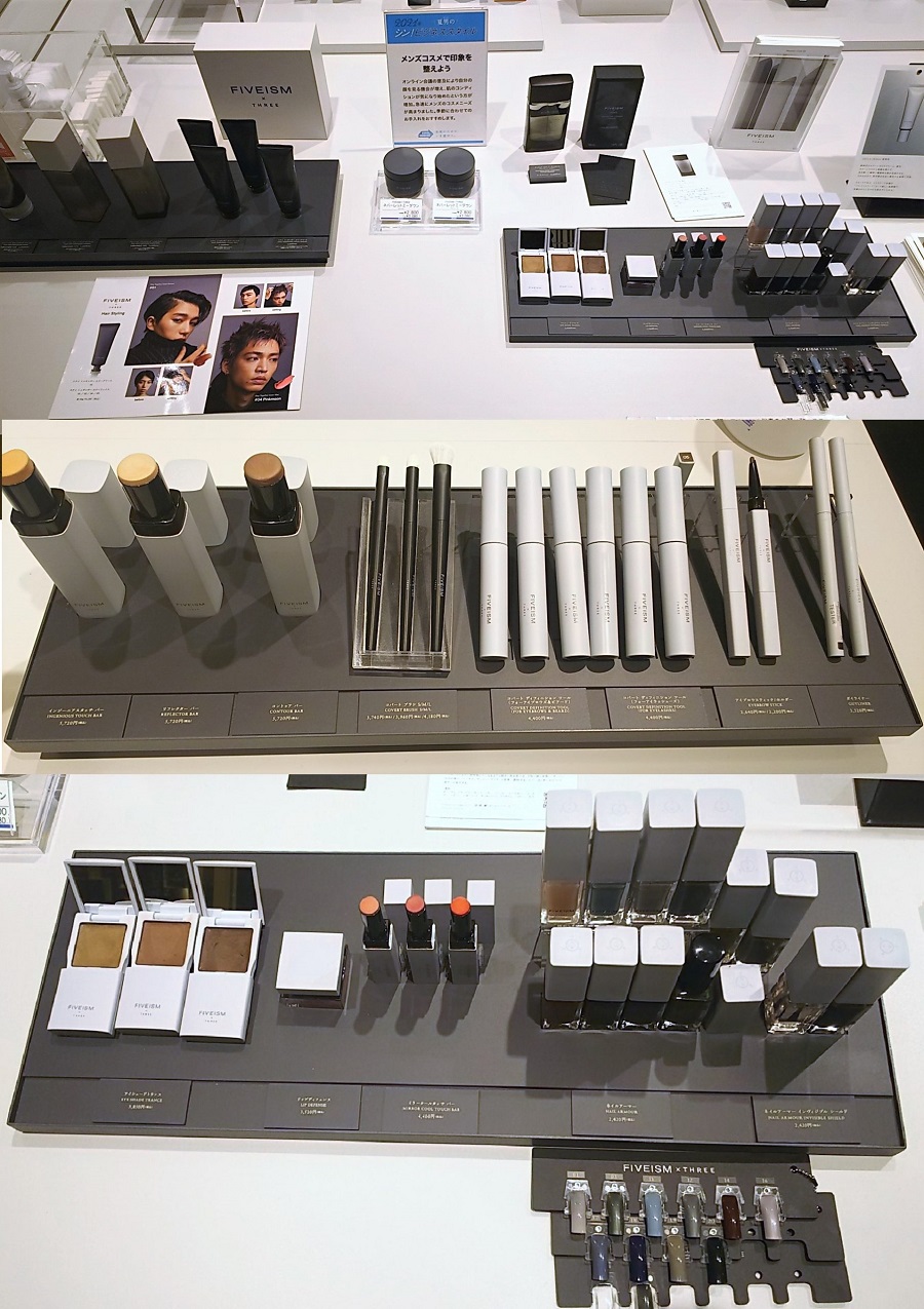 男性には疎い領域である男性化粧品には、フェースケア(スキンケア)、ヘアケア、グルーミング、フレグランスといった領域があります。フェースケアは「汚れ落とし」「化粧水」「乳液」といったアイテムでまずはお肌の循環を促し下地を作り、そのうえでメイクアップを施していきます。人気の「THREEのFIVEISM」の場合UVカット効果のあるUVクリーム、エージェントUV、コンシーラーなどでメイクアップ前のしなやかな肌を作り、肌の色や質感や凹凸を補正するベースメイクで肌の印象を整え、さらに清潔感、精悍さ、洗練性など表現したい自分のイメージを作るポイントメイクで目元や口元に演出を施します。目立たないグレーのデザインはまさに男のためのツールです。