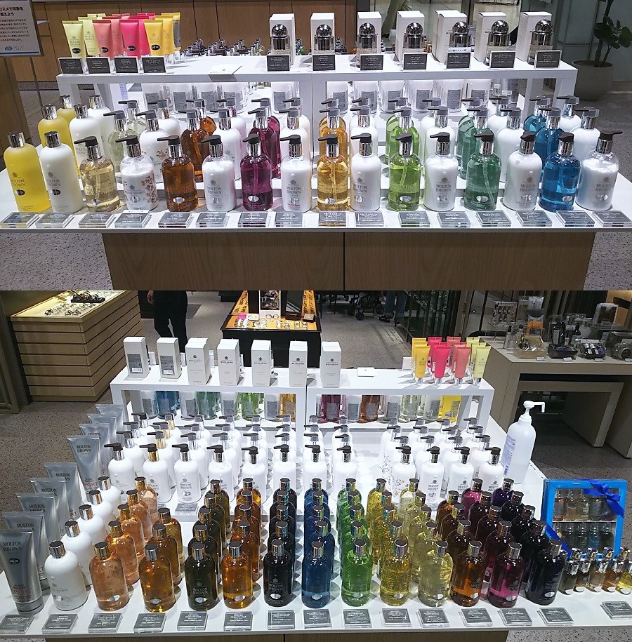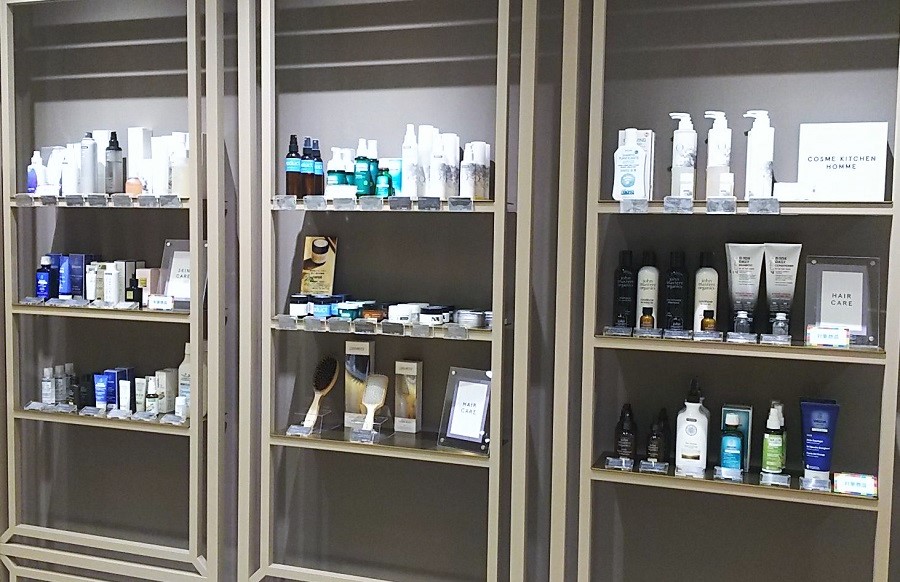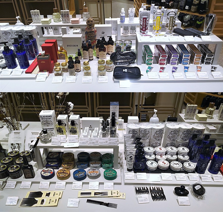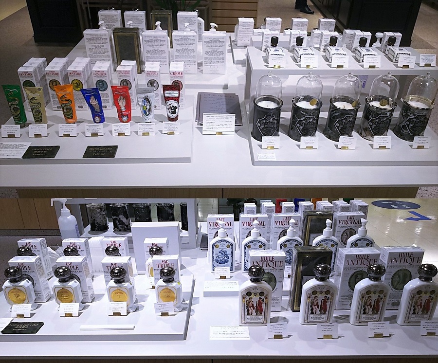 エスカレーター沿いの棚のほとんどを占めているのはすべてメンズフレグランス。もともと今のようにメンズコスメが世に出てくるまでの百貨店紳士フロアでの男性用コスメといえばフレグランスだけでしたね。そごう横浜店のメンズフレグランスは、グッチ、ブルガリ、トムフォードといったファッションブランドのものから、ザ・ディファレントカンパニー、ランセ、ノービレ1942、パルレ・モア・デ・パルファム、クリーンといった欧米の有名コスメブランドのフレグランスまで幅広いメンズフレグランスがそろいます。その種類の多さはまさに圧巻。とても一日で全部の香りのテイスティングはできそうにありません。