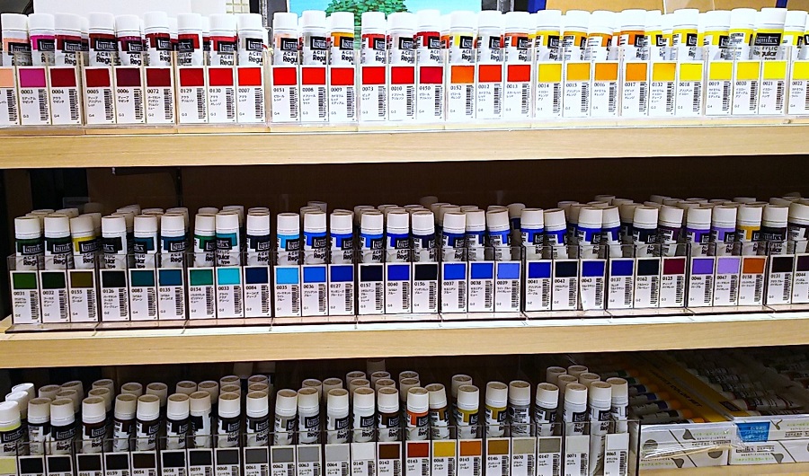 イラストレーターの方々に多く愛用されるアクリル絵の具も豊富です。