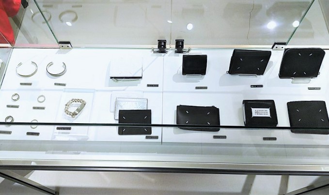メゾン マルジェラ(Maison Margiela)の革小物。並んだ数字の中のサイズ番号に〇を付けてあるマルジェラ独自のサイズ表示用チケット(布札)と、それを服に留める四隅の放射状の縫い付け糸が一つのモチーフになっています。