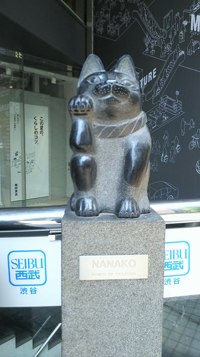 間坂を上り、不思議な三角形の穴の開いた石のオブジェを過ぎて公演通りに出たモヴィーダ館の正面入り口に立つNANAKOの像。招き猫の石像です。渋谷駅の待ち合わせと言えば駅前の犬のハチ公像ですが、こちらは公園通りの猫の像。名前は一般公募で、ハチ公(8)に対してナナコ(7)と命名されたということです。大阪出身の彫刻家、河合隆三氏によって制作されモヴィーダ館(当時SEED館)の1986年3月21日の開店時に設置されました。ここも公園通りの待ち合わせ場所としてすっかりおなじみになっています。