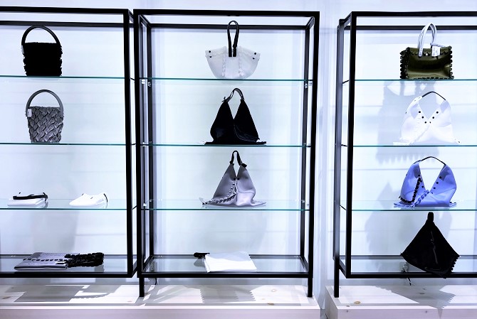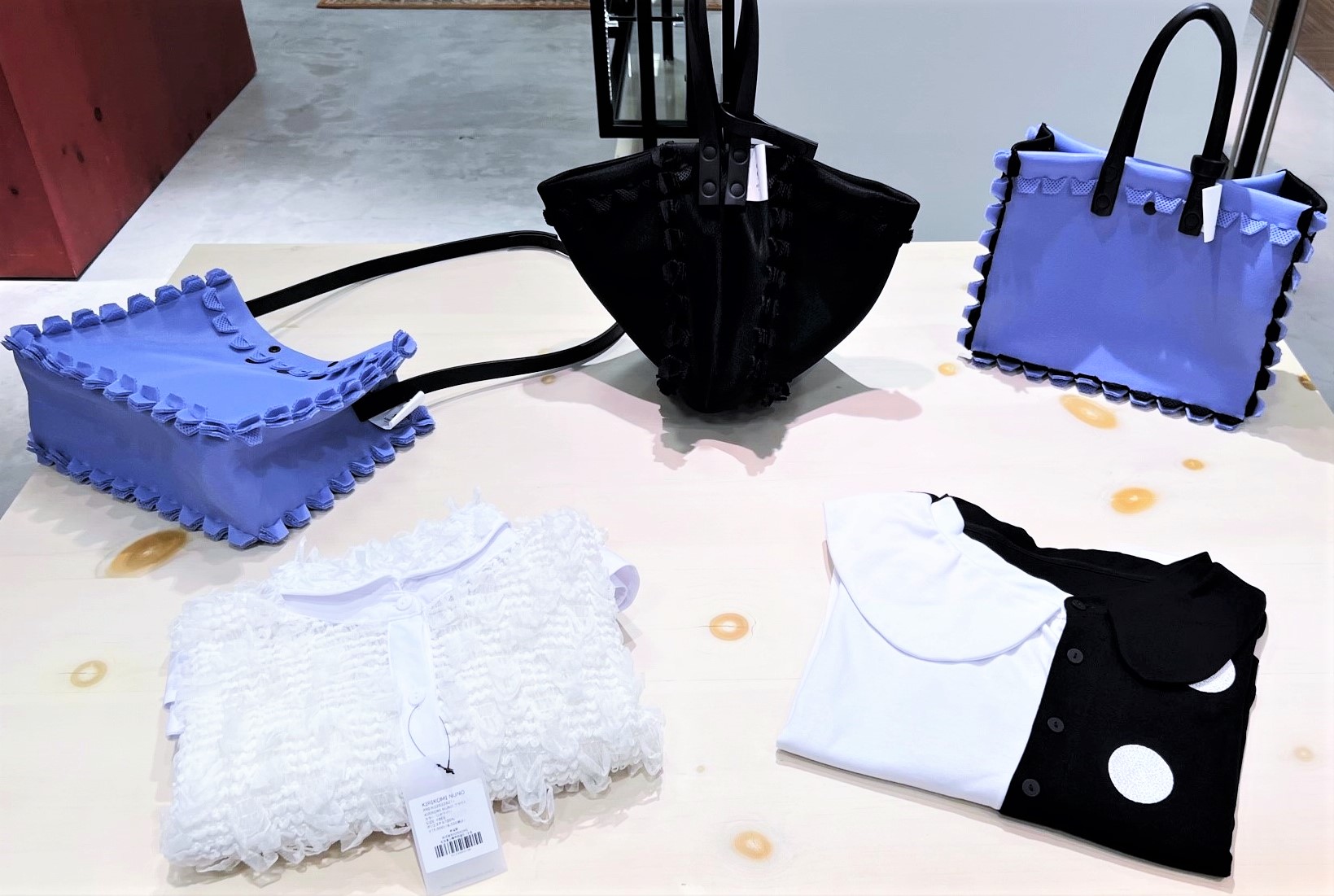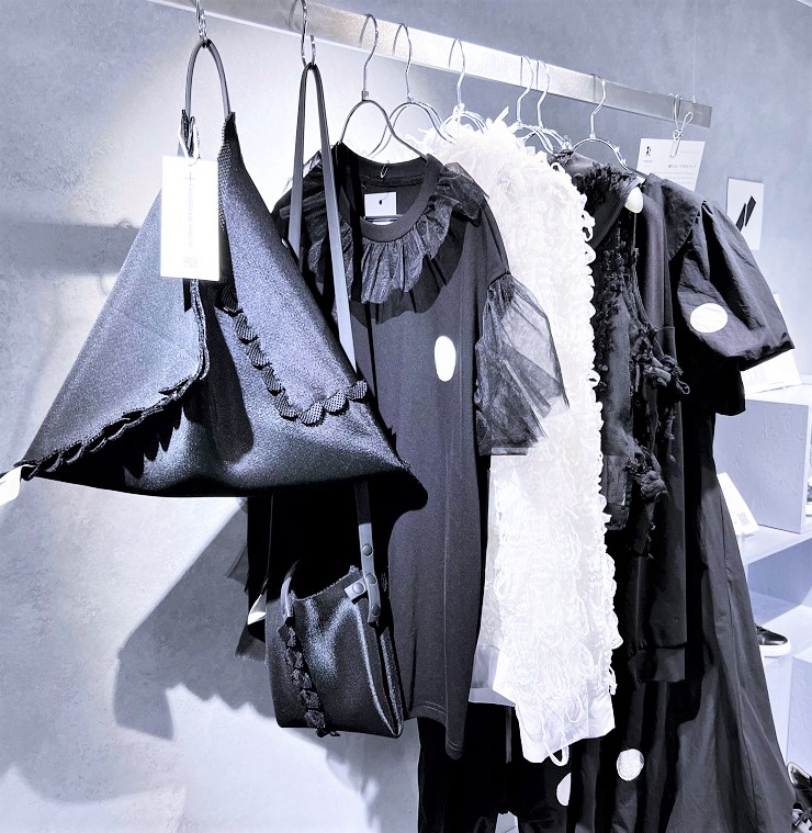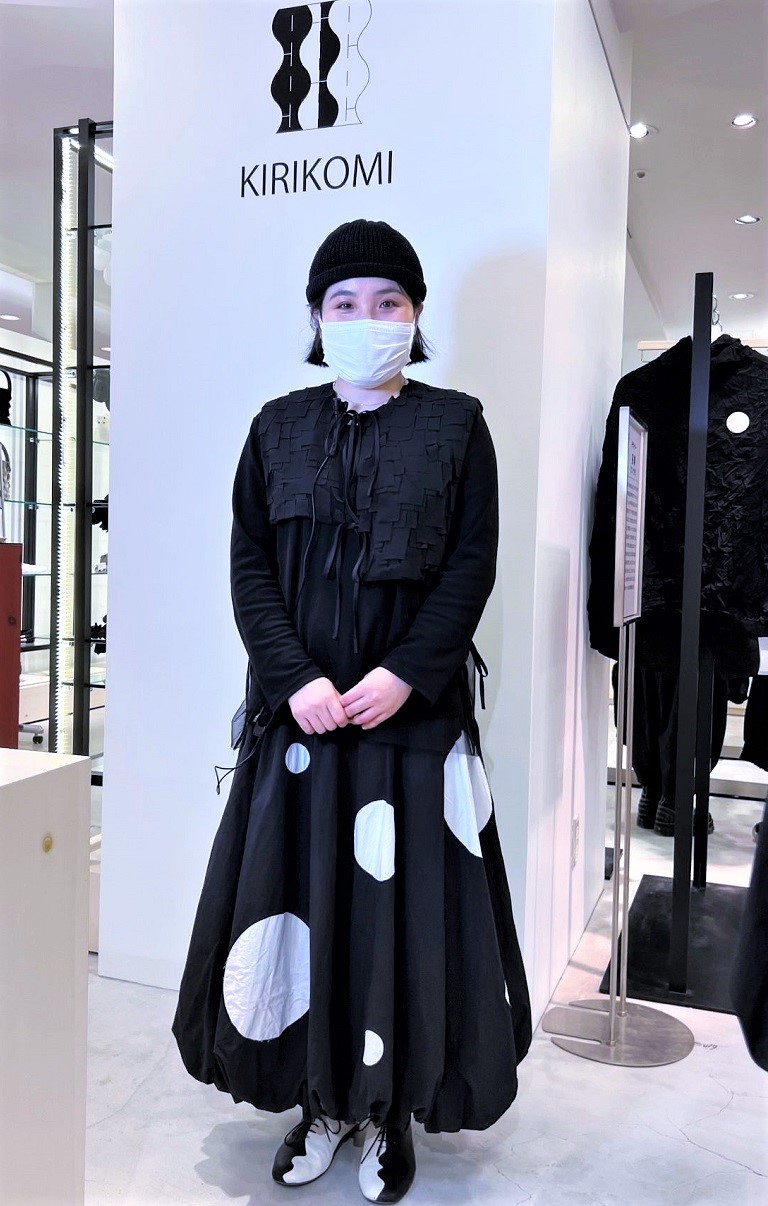 入口のテーブルの上に代表商品が並んでいます。手前左はKIRIKOMI NUNO、手前右はKIRIKOMI DOT、奥のバッグはいずれもKIRIKOMIのバッグです。特徴的な生地使いで少量生産のため、街で同じ服を着た人と出会うことはほとんどない個性的なKIRIKOMI NUNO、大きなドット(水玉)が付いていてこのドットに秘密の意味を持たせたKIRIKOMI DOT、素材をはめ込んで組み合わせることで1枚の服や1つのバッグが色々に変化できるKIRIKOMIの3ブランドの特徴がよくわかります。どれも一見大胆なアプローチでありながら、実は使う人への細やかな思いやりが感じられます。実際、KIRIKOMIの服は最近、テレビドラマなどで使われることも増えています。
