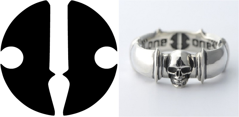 カウンターにはアクセアリーの拡大レプリカが置かれています。写真左と中央は花、右はダガーナイフがモチーフです。このようにチャーミングなモチーフがロンワンズの一番の特徴。現代のシルバーアクセサリーは髑髏や十字架など力を象徴するようなモチーフが多い中、ロンワンズは哲学的なモチーフをもとにデザインしています。洗練されたデザインでラグジュアリーな雰囲気を持ち、幅広いコーディネートに合うため男性のみならず女性のお客さまからも支持を得ています。