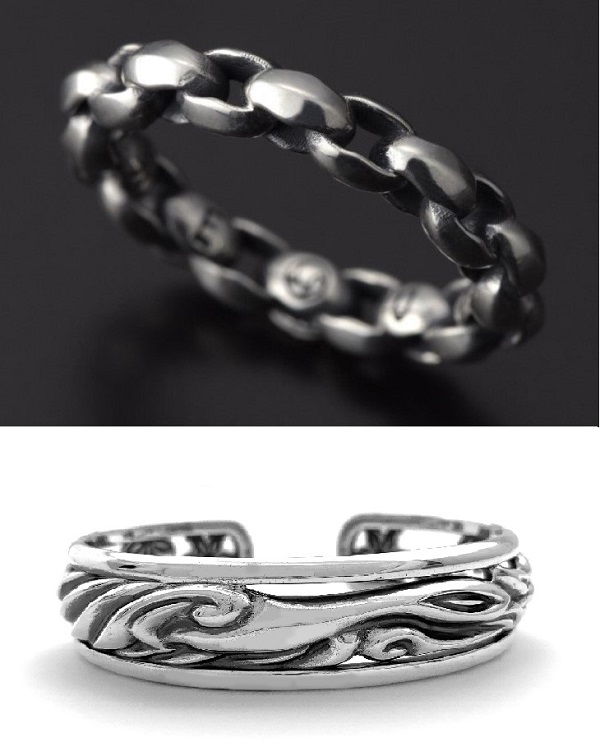 一般的にシルバーアクセサリーは、ロジウムメッキなどを施していないものでは、使用していると次第に黒ずんできます。このためどうしても日ごろのお手入れが必要です。黒ずみを消すためには薬品に漬ける方法が一般的ですが、ロンワンズでは表面の磨いた部分の裏側にある燻し加工部分の燻しが消えてしまうため、日ごろのお手入れ方法はクロスで磨くことをお勧めしています。そのためにも普段磨きにくいチェーンの裏側や彫りの溝はあらかじめ燻し加工となっています。また、クロスでの磨きが難しい場合はショップにお持ちいただければクロス磨きとともに超音波洗浄も行っております。