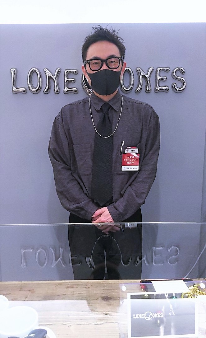 鎌田店長はワインや車の販売を経験後、2019年からロンワンズで店頭販売と営業を担当しています。ロンワンズはブランド設立間もない1990年代後半から日本でもミュージシャンや国民的アイドルが愛用しCM撮影などでも使用されました。そのため、90年代に青春を送った世代のお客さまがいまも大変多いとのことです。また、横浜店がオープンしてから気づいたことは、湘南方面をはじめとするシーサイドライフを楽しむお客さまが多いということです。実際にプロサーファーのお客さまもいるとのこと。同じ湾岸の千葉県からも東京湾アクアラインを使って車で来店される方がいらっしゃいます。そして最近とくに増えてきたのが女性のお客さま。コーディネートしやすいデザインが幅広い年齢層から人気です。これからも老若男女の方々にシルバーアクセサリーの魅力をお伝えしていきたいとのことです。