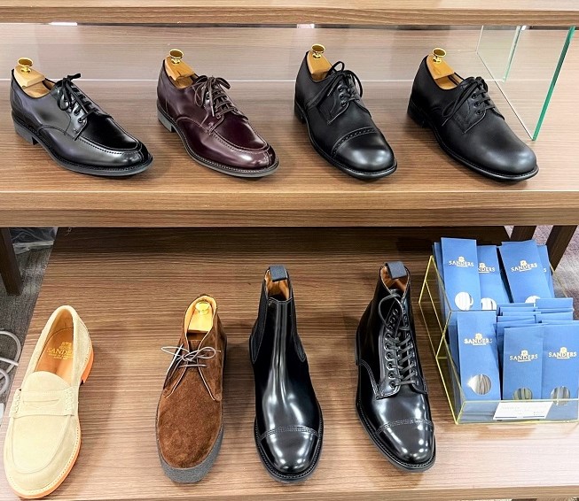 1872年創業のイギリスのサンダースはイギリスのシューズメーカーのほとんどが並び、紳士靴の聖地とも称されるノーザンプトンの老舗。イギリス国防省御用達シューズメーカーとして陸海軍に軍靴を納めていたメーカーだけに男らしい雰囲気が人気です。サンダースのミリタリーダービーコレクションは表側に靴紐のハトメを出したスタイルや強度を高める三本ステッチなどが使われ、しかも底在にはコルクを敷き詰め足に馴染むよう作られているため、オンとオフのシーンを選ばないシューズとしてスーツスタイルからジーンズまで合わせられる稀有なアイテムです。また短靴とハーフブーツがあるバックスキンで作られたブリットシューズは1960年代の映画「ブリット」で主人公が履いていた靴として今も高い人気です。