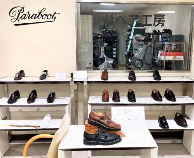 リペア工房もあります。壊れてしまった靴のご相談にも応じています。手前に並ぶのはフランスのパラブーツ。こちらはフランスのトラッド靴とも言われるがっしりした作りで、これまたカジュアルとドレッシーのどちらにも使える便利な靴です。