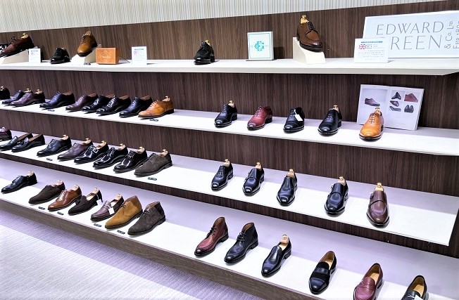 ここからインポートシューズのコーナー。インポートシューズはボリューム感あるフォルムと頑丈な作りのイギリスの靴とスマートなフォルムでスタイリッシュな雰囲気のあるイタリアの靴に大別されます。それぞれ、着るものの雰囲気によって選らばれるお客さまがたくさんいらっしゃいます。そごう横浜店では特にイギリスブランドの編集に力を入れており、エドワード・グリーン、チャーチ、チーニー、サンダースといったブランドがそろっています。特にエドワード・グリーンは神奈川県唯一の展開です。