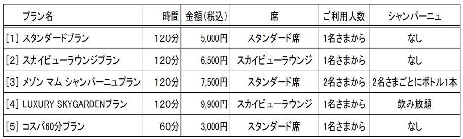 全プランでブルワリー直送「鎌倉ビール」3種類+国産ビールやオリジナルカクテルなど約20種類のドリンクとエスニック料理がすべてビュッフェスタイルでお楽しみいただけます。[1]スタンダードプラン(120分) 5,000円(税込)はオリジナルバックリブやサテ、点心など全種類のフード・ドリンクが食べ放題、飲み放題のスタンダードプランです。[3]メゾン マム シャンパーニュプラン(120分)7,500円(税込)はシャンパーニュボトルが付いた記念日やパーティーにもおすすめのプラン。卓上にシャンパーニュがある特別感をお楽しみいただけます。 [5]コスパ60分プラン(60分)3,000円(税込)は気軽にサクッとビアガーデンの雰囲気を味わえるコスパの良いプランです。