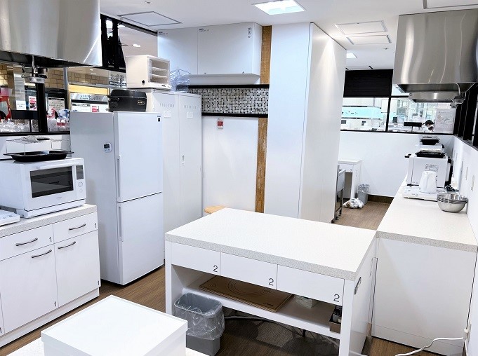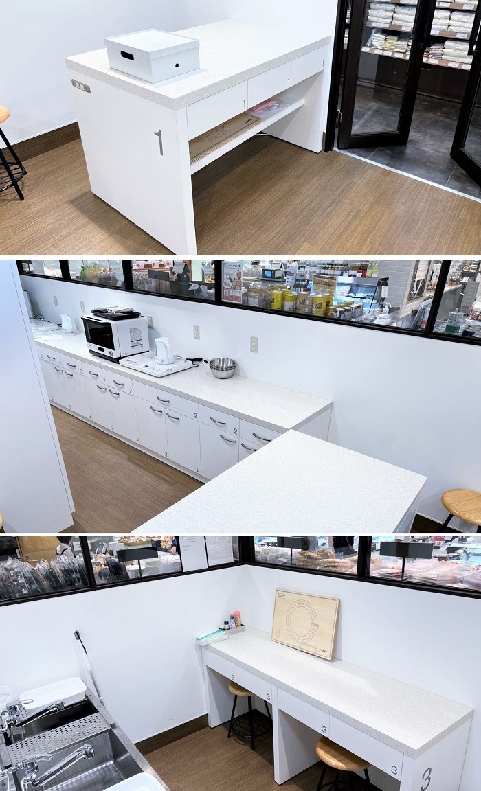 富澤商店コミュニティスペースにはそれぞれの調理台の引き出しに調理に必要な調理器具と食器類がそろっており、4名さまが着席できるスペースが2つと2名さま着席のスペースが1つあります。