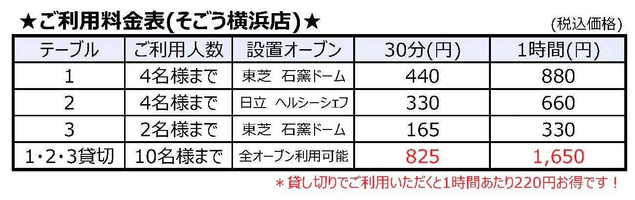 テーブル①は定員4名(9㎡)で東芝 石窯ドームを設置。テーブル②は定員4名(9㎡)で日立 ヘルシーシェフを設置、テーブル③は定員2名(7㎡)で東芝 石窯ドームを設置してあります。それぞれのテーブルには2口のIHコンロ、電気ケトル、フードプロセッサー、貝印ハンドミキサー(ターボ付)ほか各種の焼き型、包丁まな板類、計量カップ、口金、ボウル、鍋・フライパン類、めん棒、うらごし、食器類、カトラリー、塩、コショウ、醤油、オイルスプレーなどたいていの料理に対応できる備品類のご用意があります。また1部屋貸し切り(テーブル①②③)では定員10名(25㎡)であり、すべてのオーブンが使用できます。また冷蔵庫、炊飯器などは共用となっております。