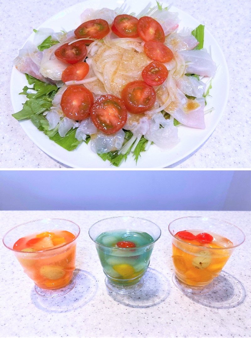 上は刺身用の鯛と水菜を使った梅肉ソースの和風のカルパッチョ。下はアガーを使ったフルーツゼリーです。この記事の動画では作り方の詳細をご説明しています。