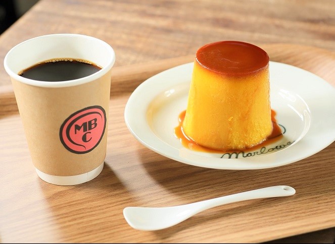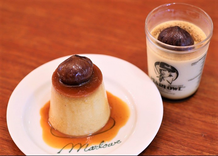 プリンセット【お好きなプリンとドリンク】1,210円~(税込)。プリンによって価格が違うため、プラス料金が発生することがあります。またこのカフェではプリンは基本ビーカーからくり抜いて提供いたします。くり抜くことによりプリン全体にカラメルがかかりよりおいしく召し上がることができます。一部陶器入りのダークラムのように陶器ごとお出しする商品もございますが陶器・ビーカーはお持ち帰りはできません。【マーロウオリジナルブレンドコーヒー】単品価格はSサイズ440円(税込)、 Mサイズ550円(税込)になります。